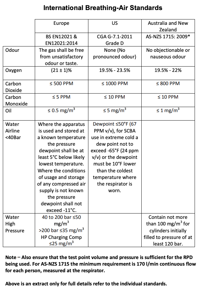 Requirements are specified in the standard for acceptable levels of oxygen, lubricants, oil, odour, taste, carbon dioxide, carbon monoxide and water content in compressed breathing air.
